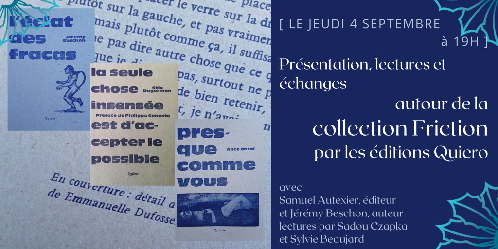 Nous avions le bonheur de recevoir Samuel Autexier, fondateur et éditeur des éditions Quiero, pour une présentation accompagnée de lectures autour de la création de la collection Friction.