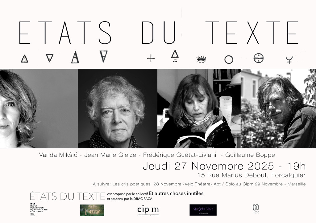 Lectures de Vanda Mikšić, Jean-Marie Gleize, Frédérique Guétat-Liviani et Guillaume Boppe.