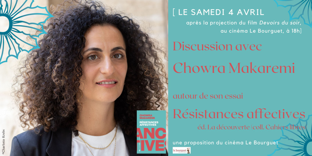 Le cinéma le Bourguet formule une invitation à l'anthropologue Chowra Makaremi à laquelle nous sommes heureux de nous associer pour le temps d'échange autour de son livre Résistances affectives, qui suivra la projection du film Devoirs du soir (Abbas Kiarostami - 1989).